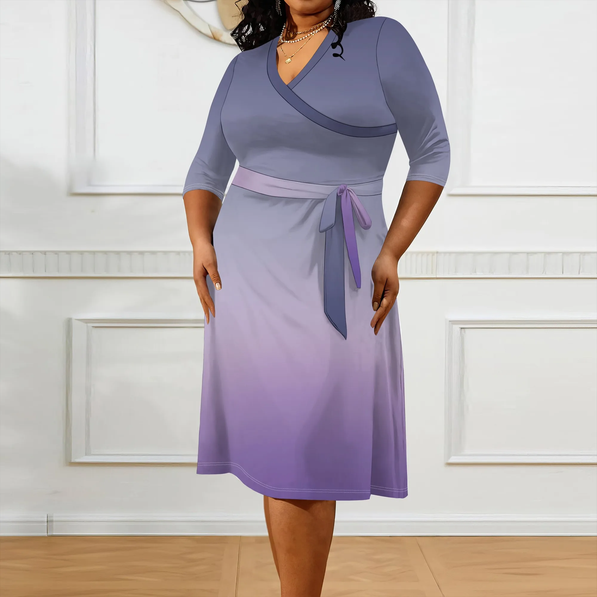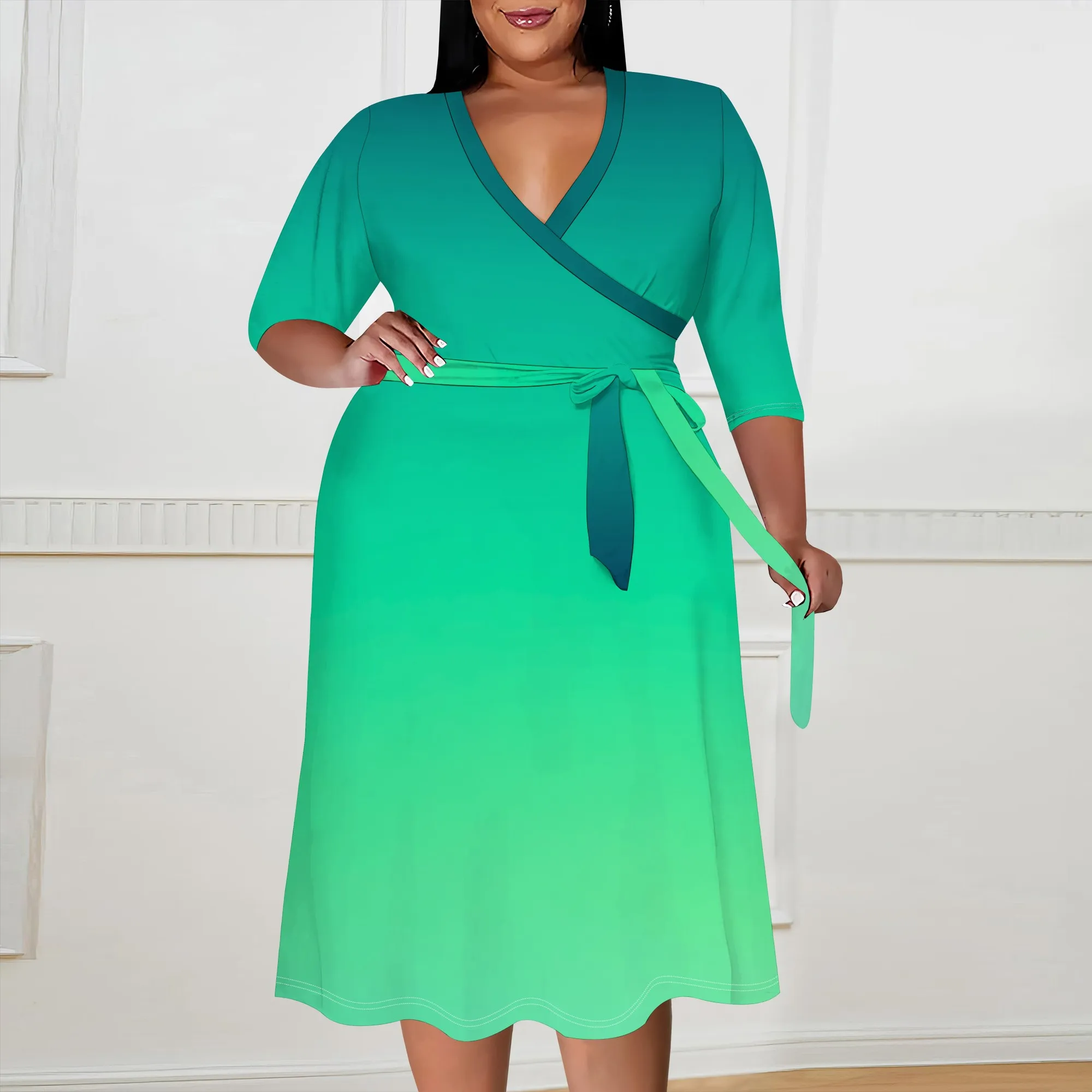 2025 Plus Size Women Summer Solid Color Gradient Maxi Dress Casual V Neck 3/4 Sleeve Sexy Dresses with Belt